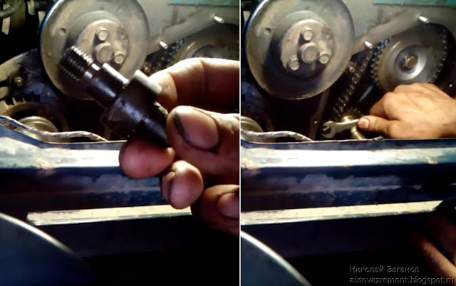 — если этого не произойдет, то требуется постучать по натяжителю, наверняка заел плунжер в нем, башмак должен отщелкнуться;
