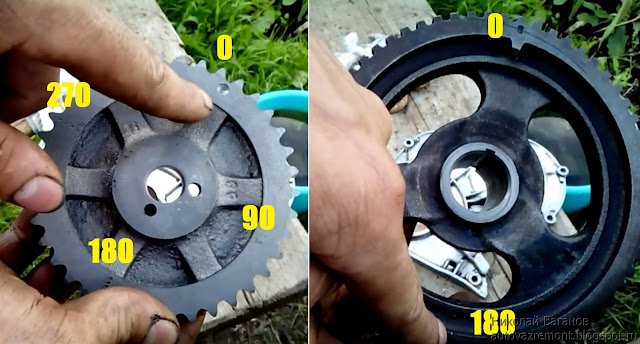 Теперь можно устанавливать звездочки и цепь, но предварительно на новой звезде распредвала и шкиве коленвала кернером или зубилом наносим метки: на звездочке через каждые 90 ° градусов, на шкиве коленвала через 180°. В будущем э то поможет нам сэкономить время при настройке теплового зазора в клапанах.
