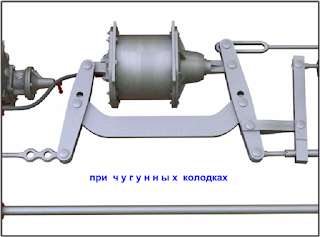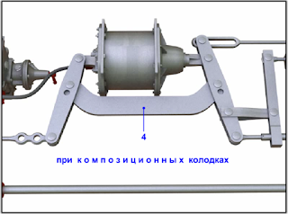 При композиционных колодках затяжка горизонтальных рычагов должна быть соединена по отверстиям в горизонтальных рычагах, расположенных ближе к тормозному цилиндру, при чугунных колодках дальше от тормозного цилиндра.